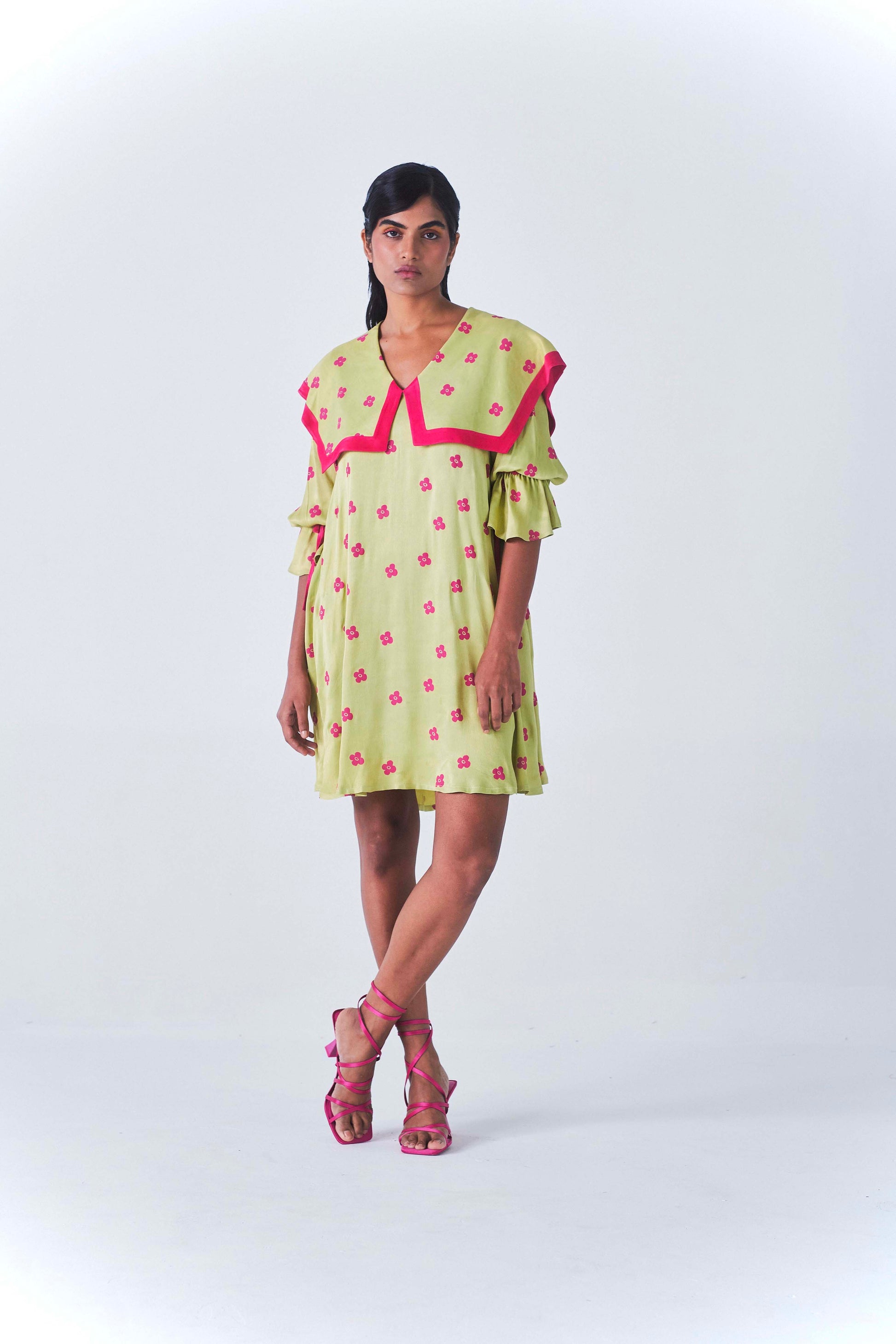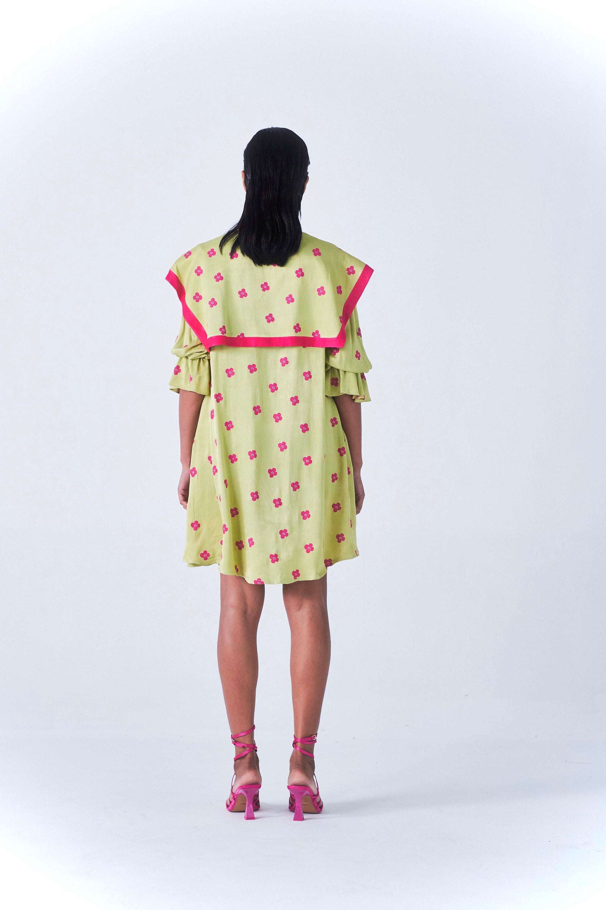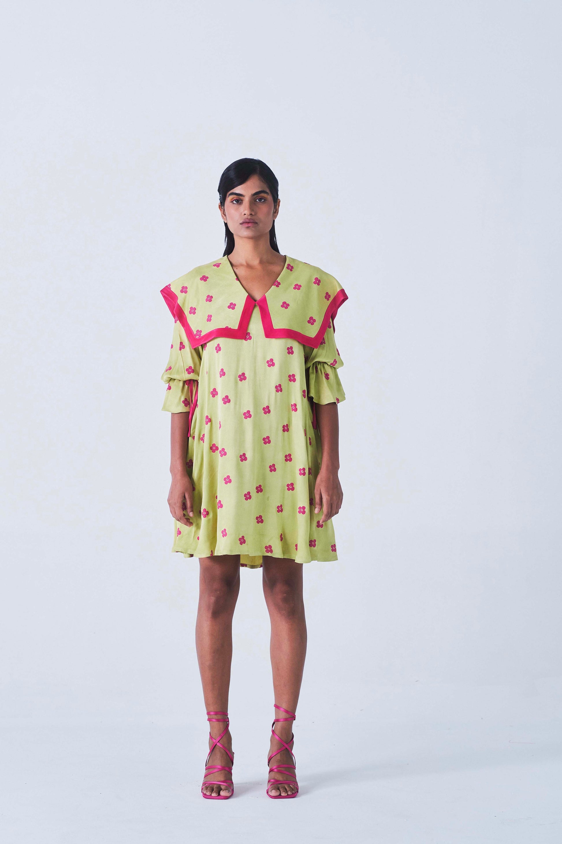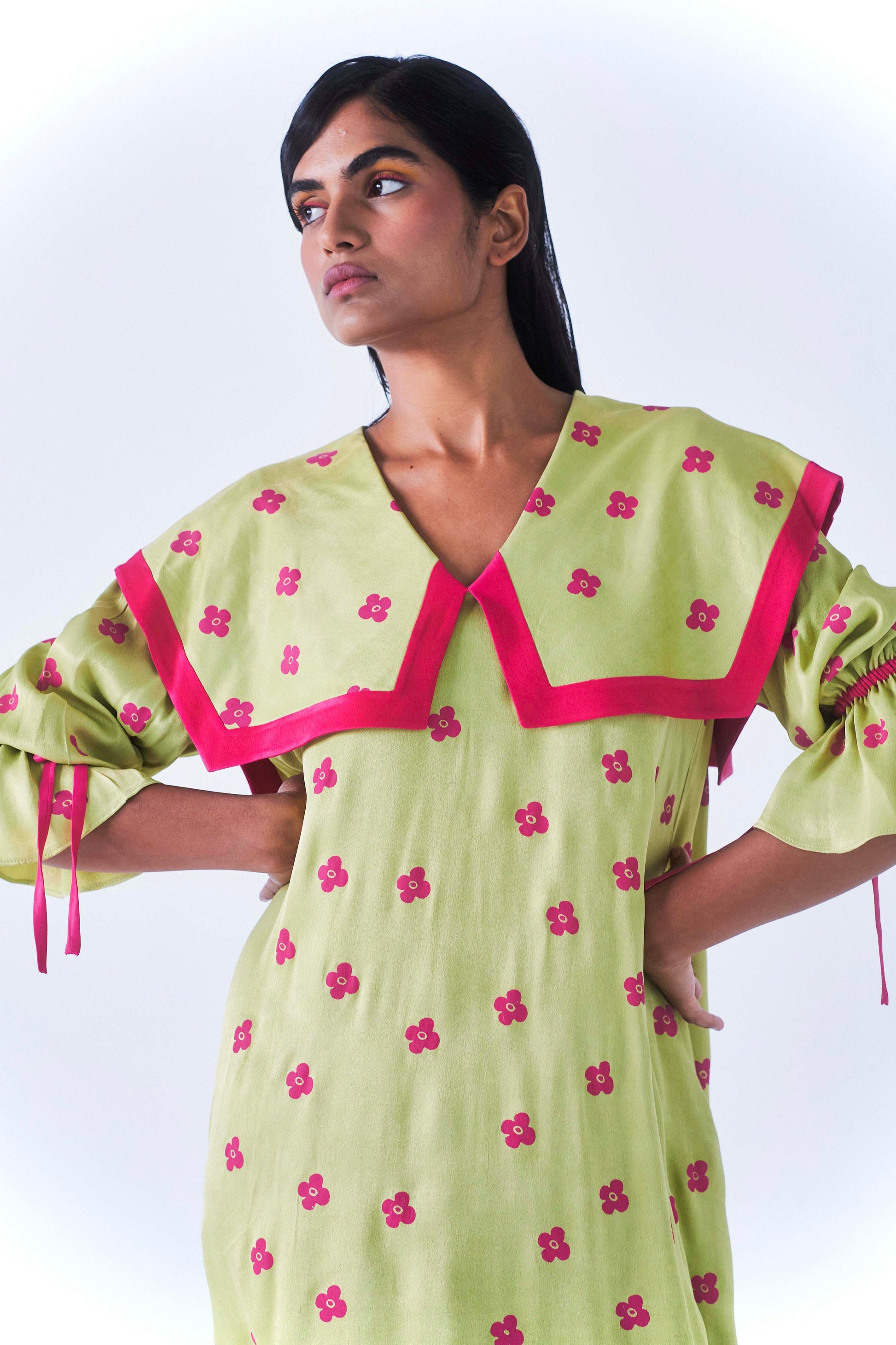 Bold hot pink borders and screen printed flowers accentuate this dress made of fluid orange fiber fabric. The exaggerated squared collar makes a statement. This style has inseam pockets.
