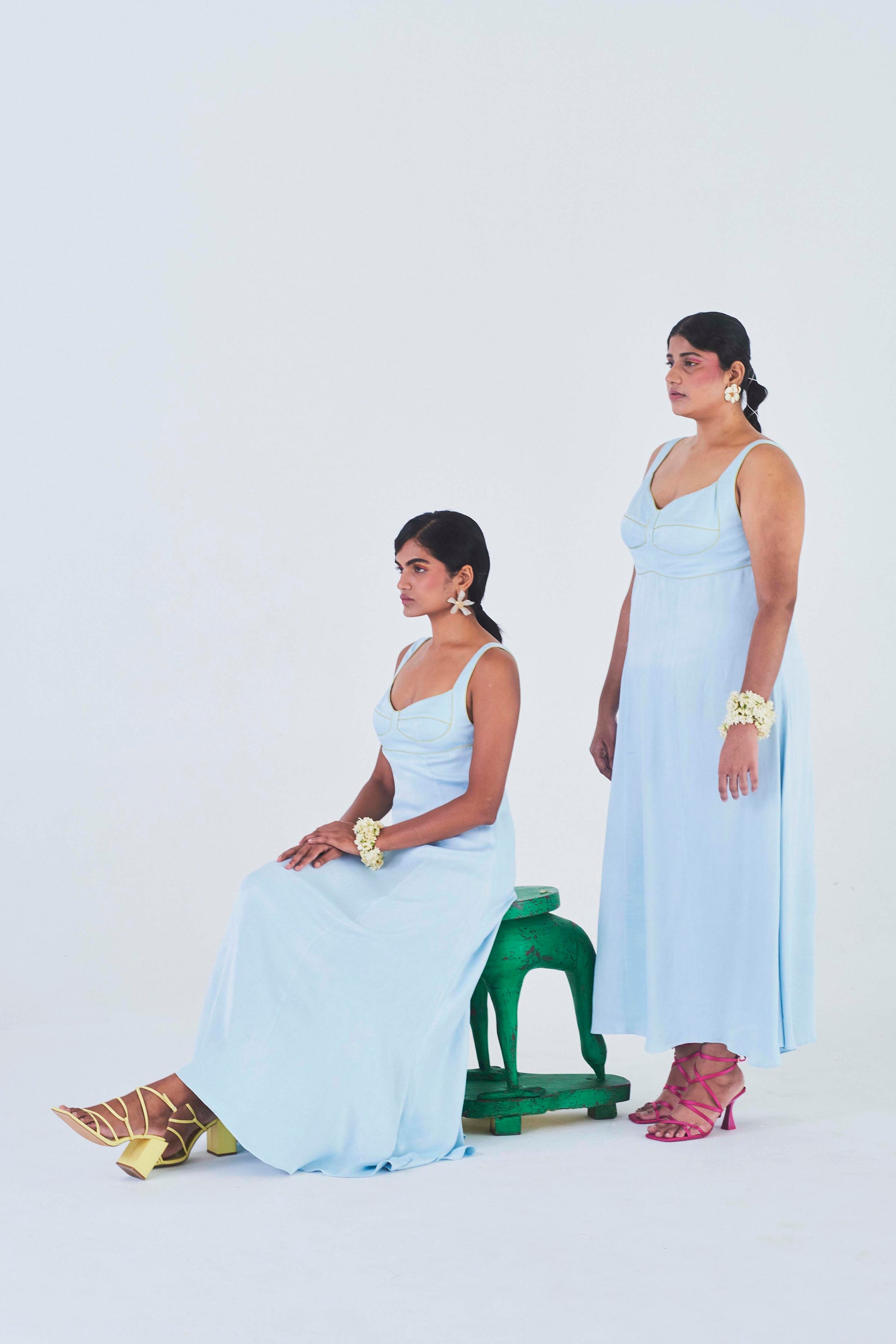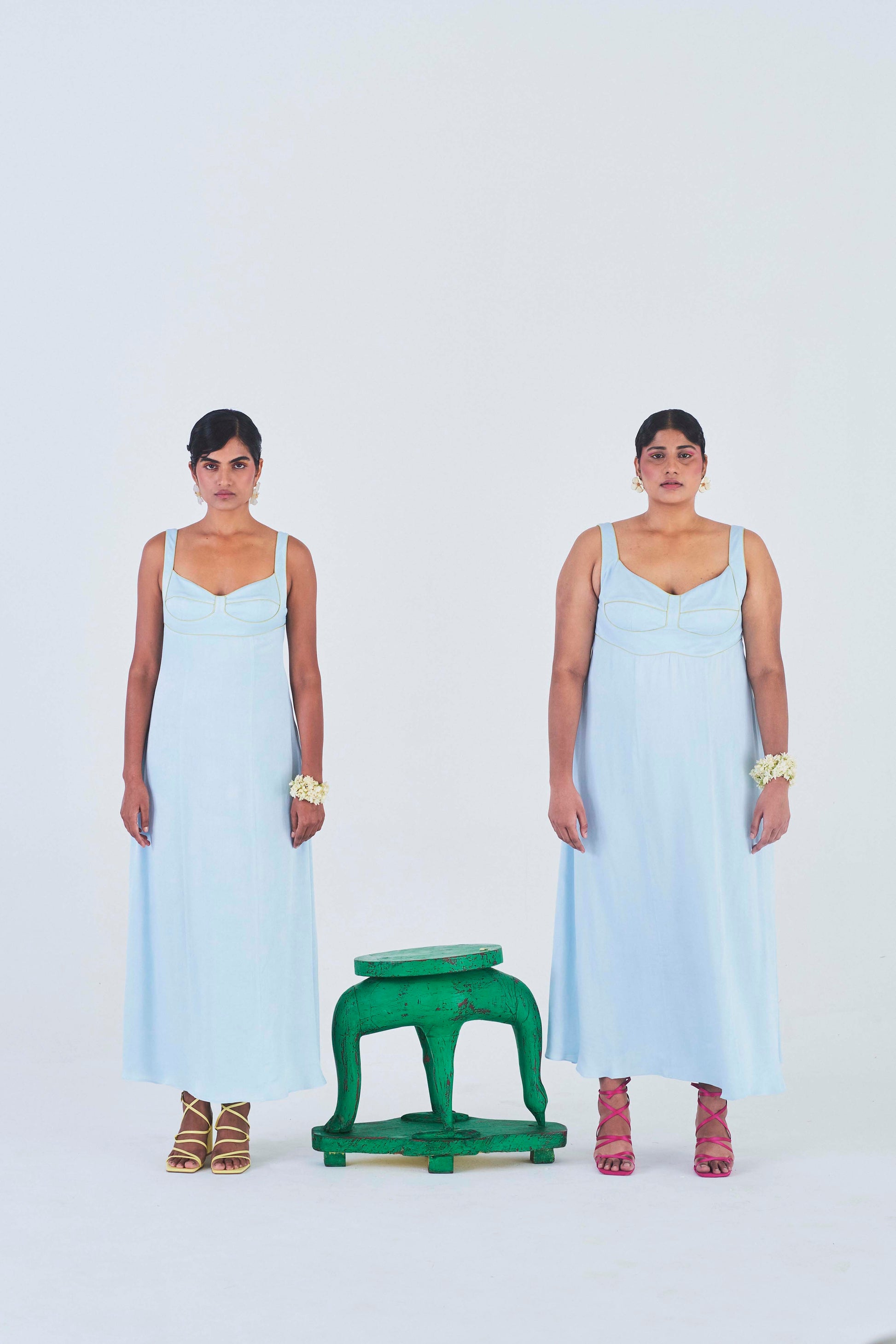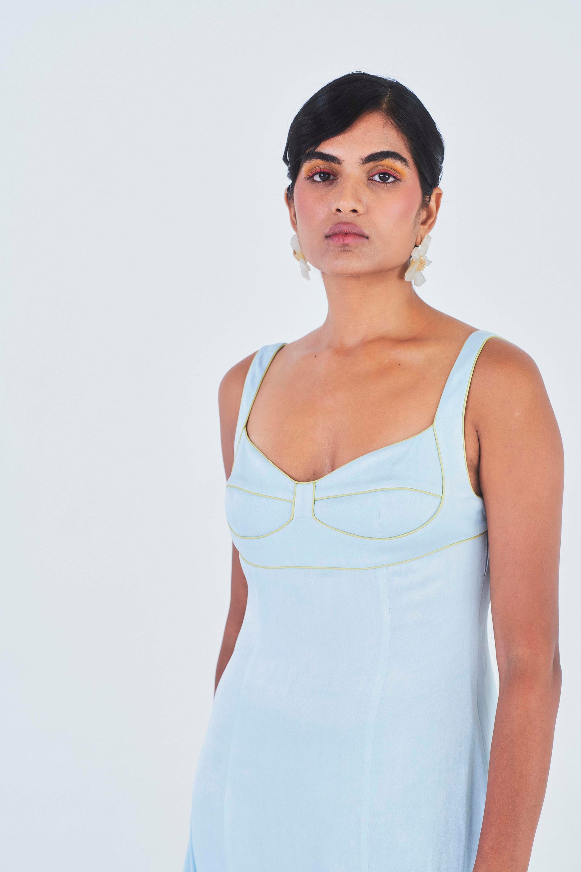 In both sky blue and light green, this ankle length slip dress has a bustier style top accentuated by alternate color piping. The orange fiber dress falls freely. A concealed zipper runs along the side.