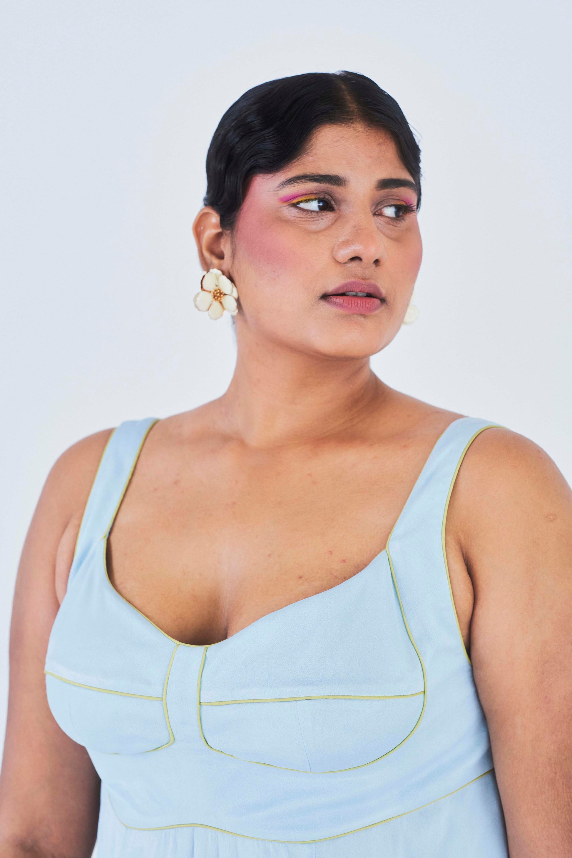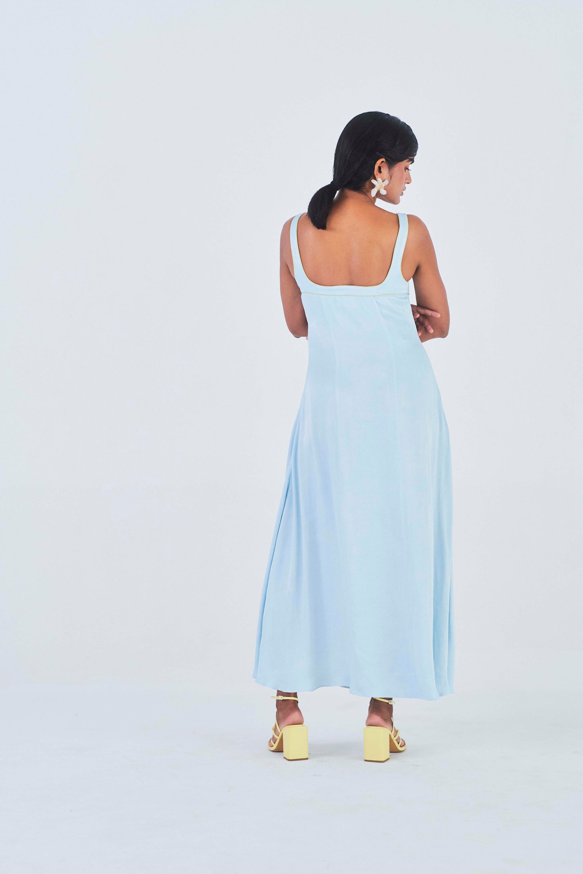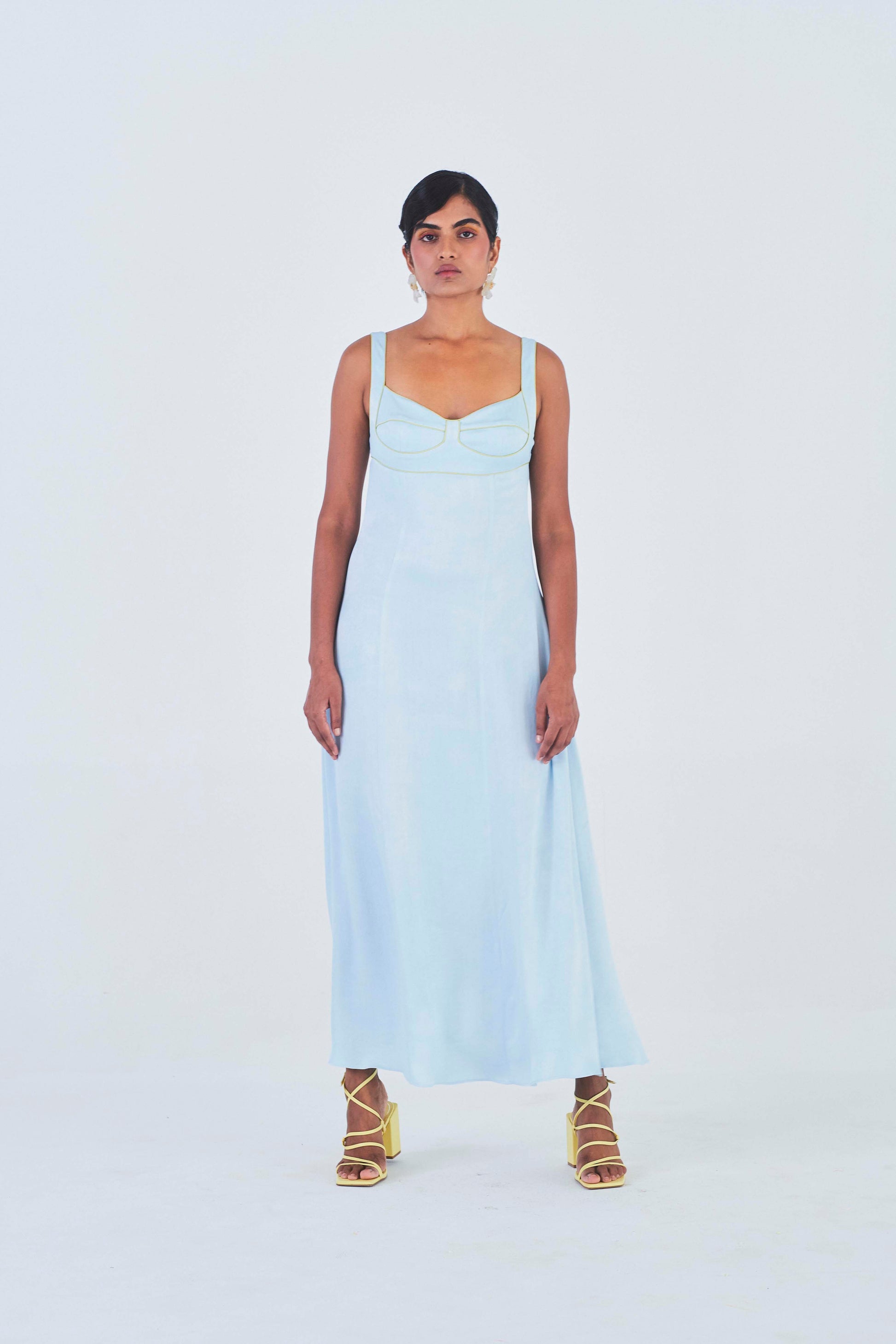 In both sky blue and light green, this ankle length slip dress has a bustier style top accentuated by alternate color piping. The orange fiber dress falls freely. A concealed zipper runs along the side.