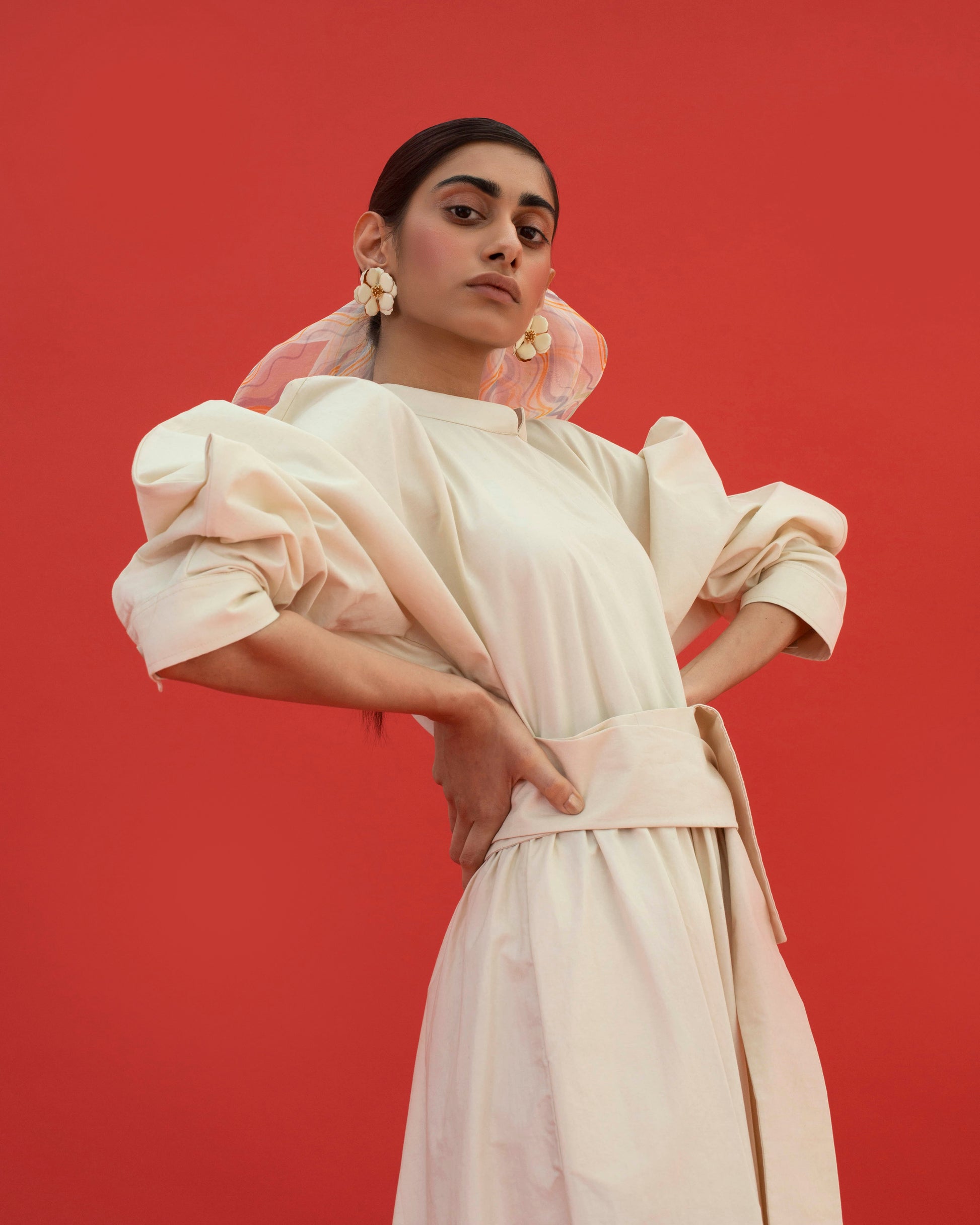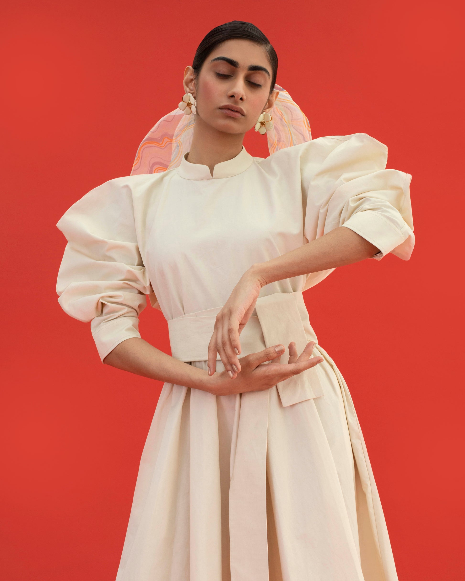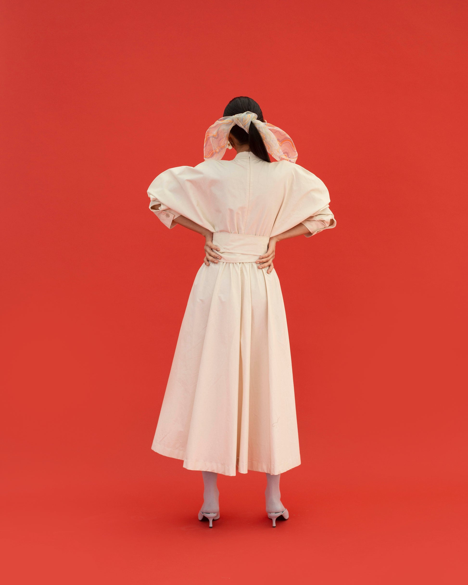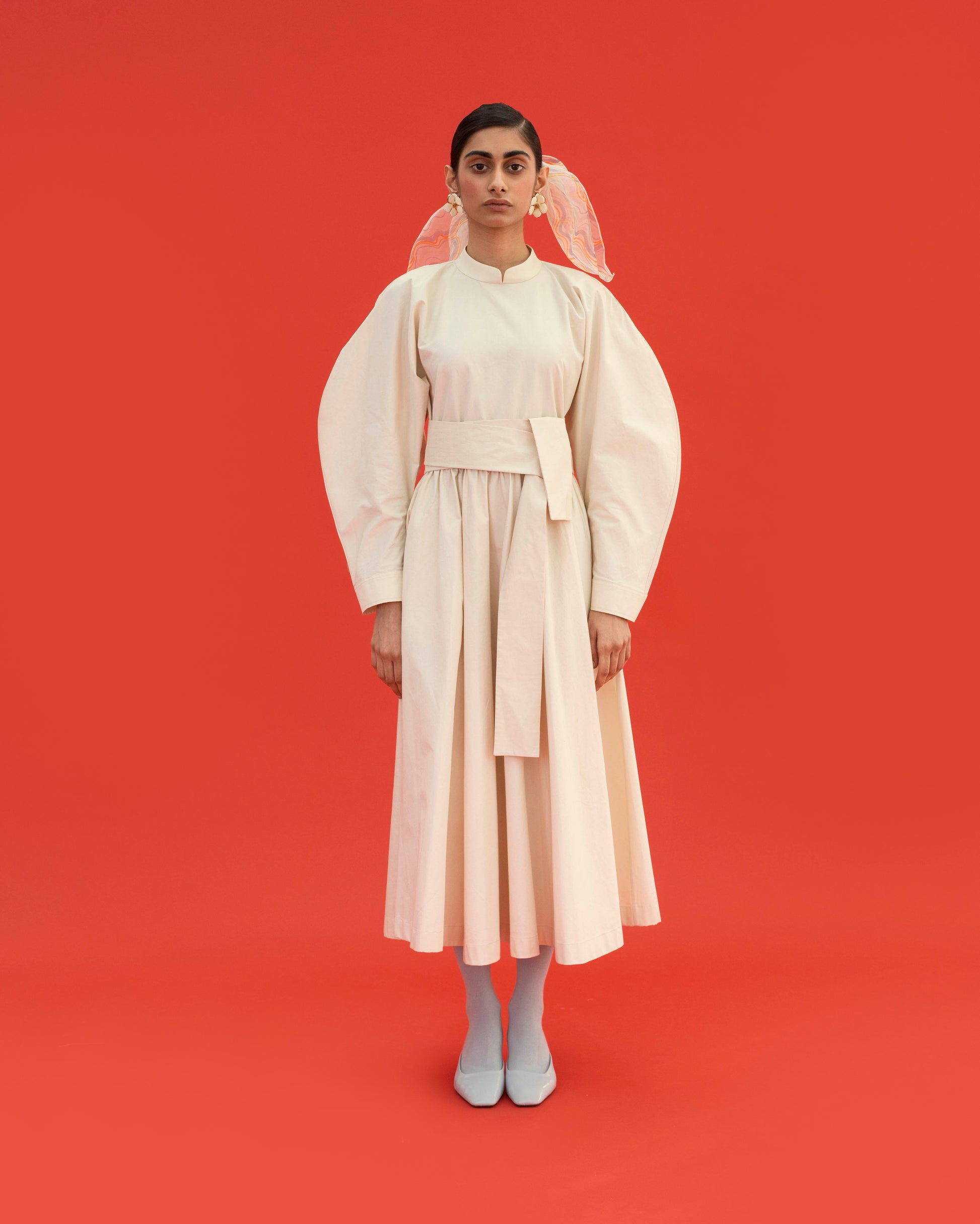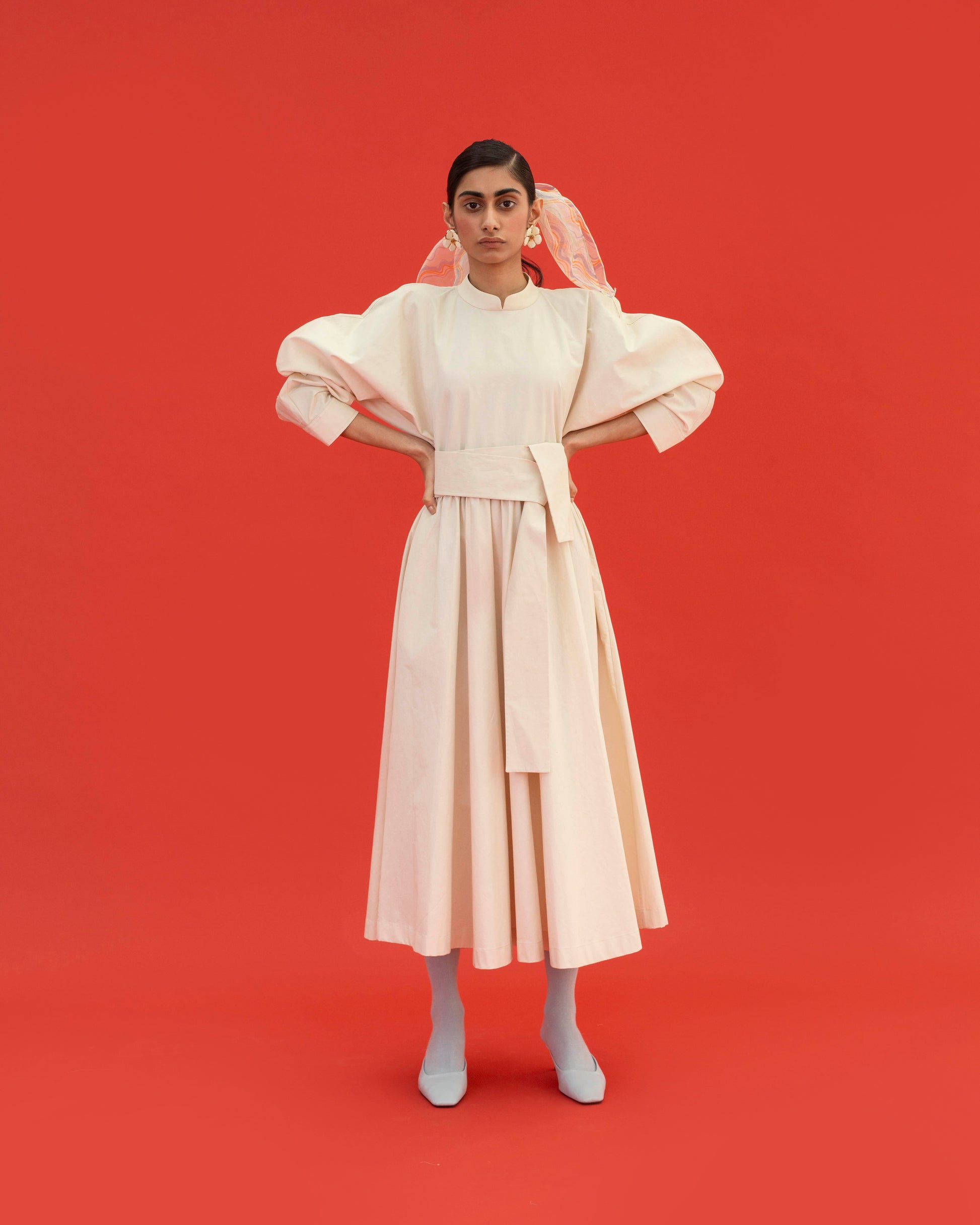 Midi dress in a beautiful cotton fabric with a stylised mandarin collar and a separate adjustable waist band for comfort, Dress has zipper at the back.