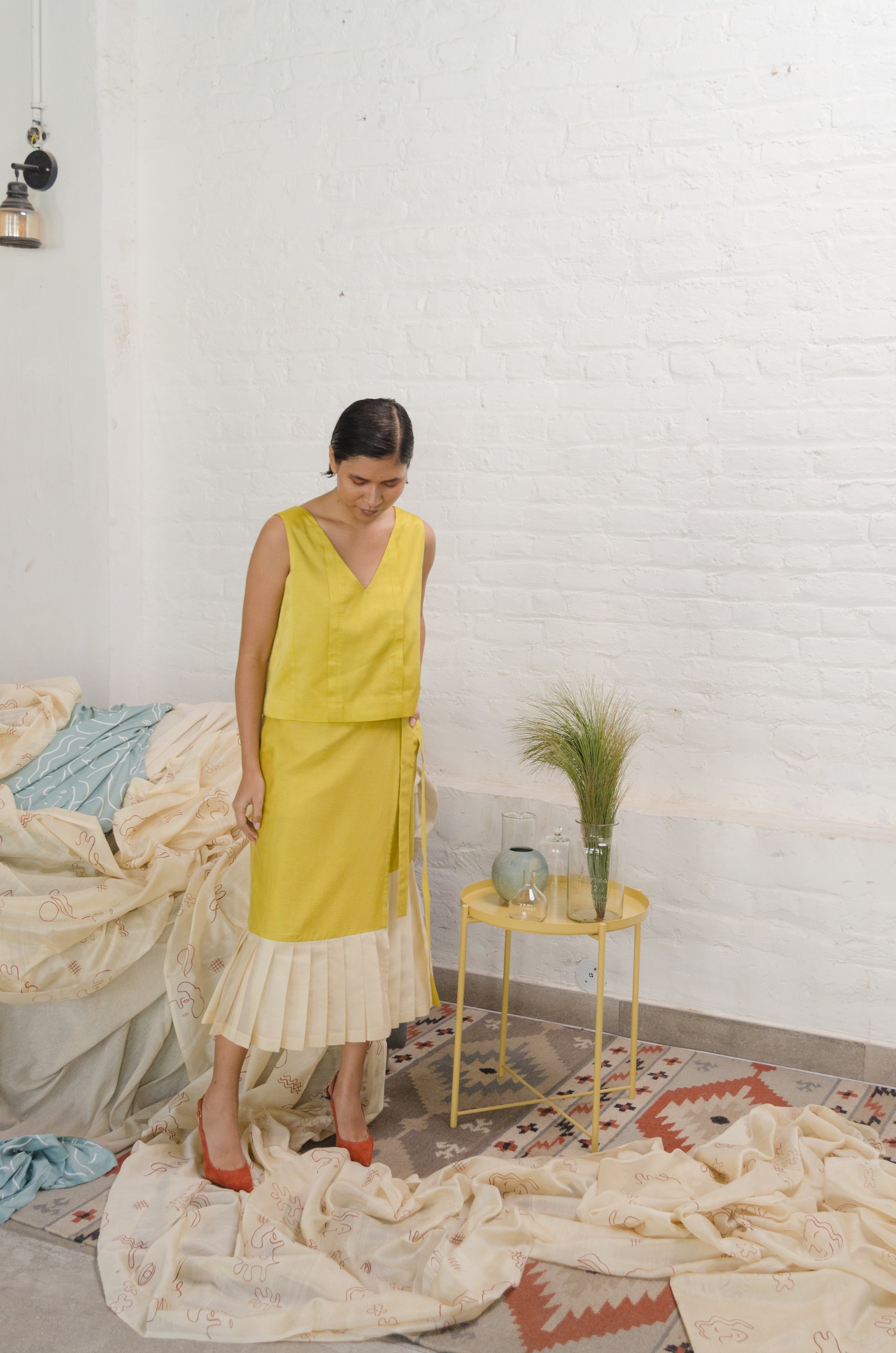 This Lime yellow and ivory Gabriella pleated wrap around skirt is made out of Chanderi fabric and This top is made from our chanderi with two knife pleats and V-shaped neck in both front and back. It's a straight fit, loose top, Does not stick to the body.